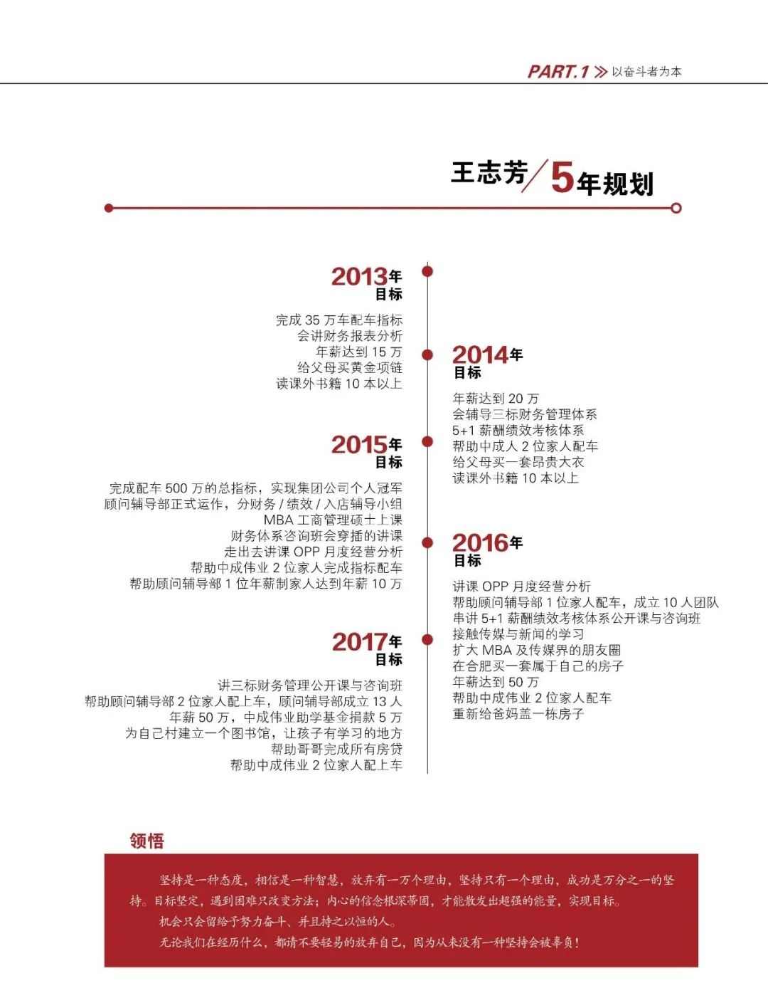在那一刻,内心有一个声音坚定地告诉她自己“一定要留在这里”,留在这里可以配车的,只要留在这里,好好干就可以享受股份分配。年会结束后,她虔诚地写下了自己的五年规划,给自己确定了奋斗目标,坚定信念和决心以实现五年规划,奋战2013年!